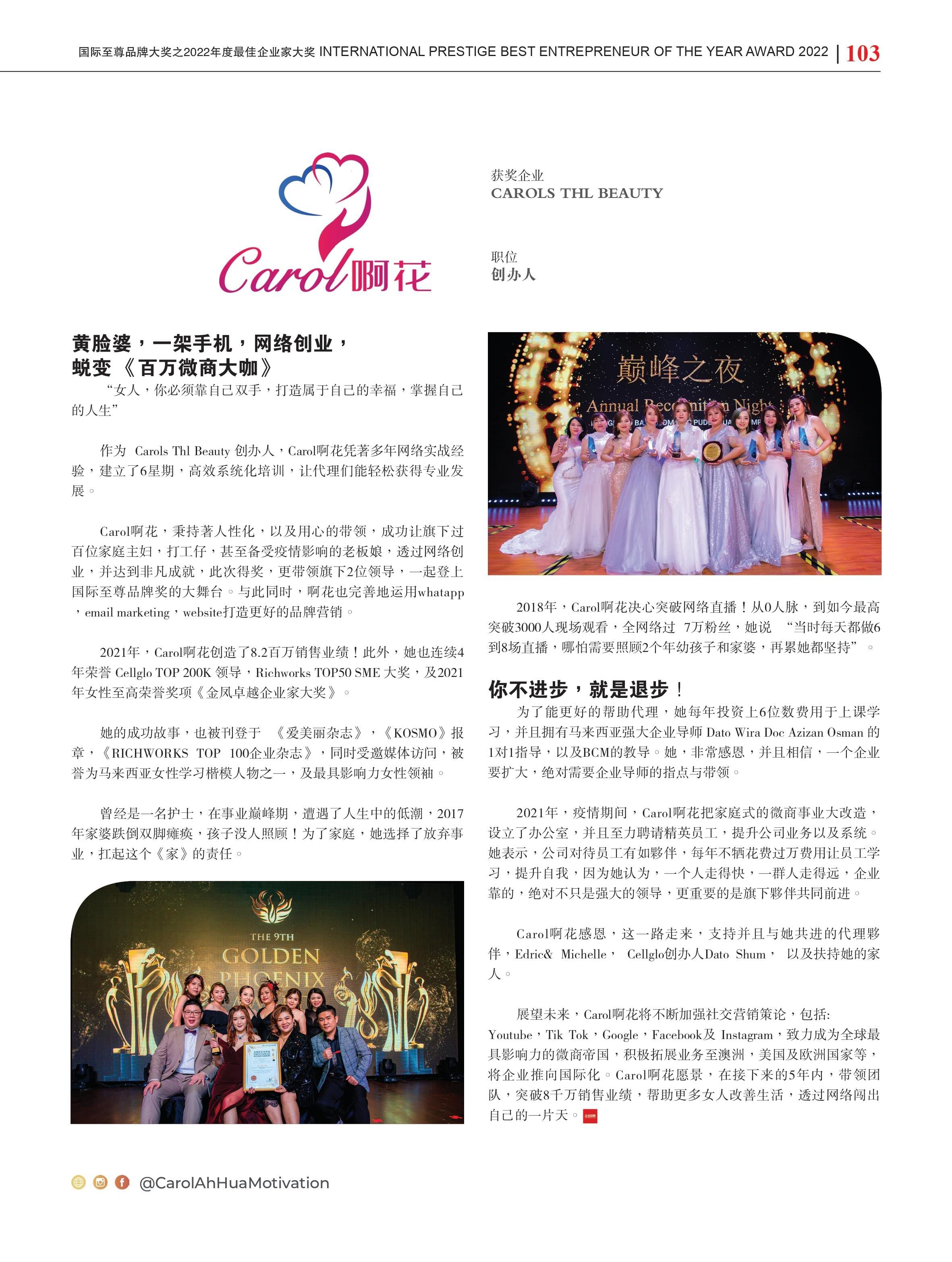 2019年,她荣幸地被颁发为“平台顶尖二十名最具有影响力的合作伙伴”并在2020年,创造了接近3百万销售收入。